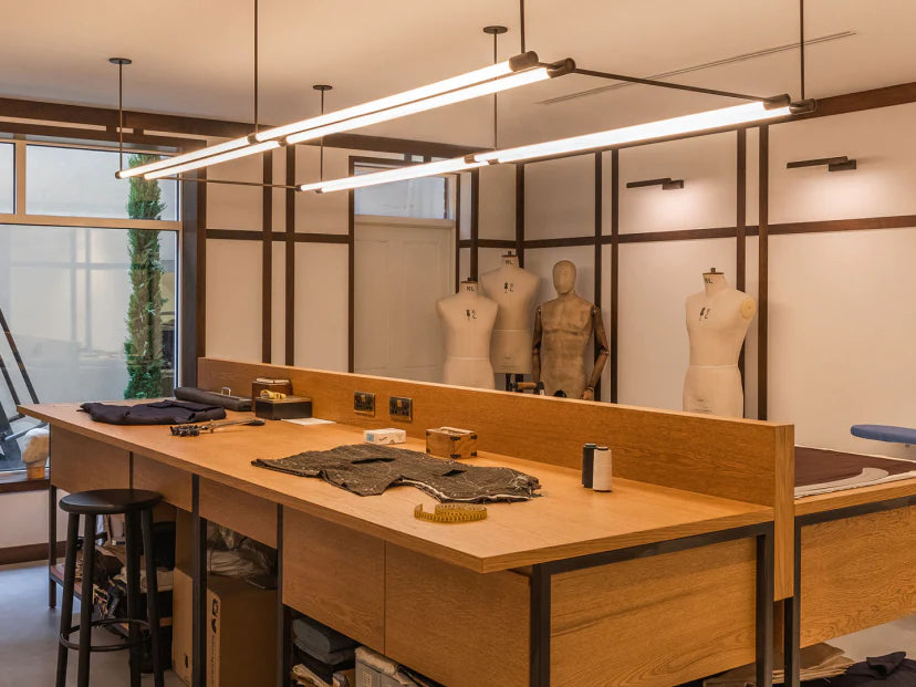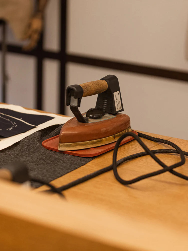 Our bespoke tailoring is made in the workrooms at our Old Burlington Street townhouse by a dedicated team of craftspeople, many of whom specialise in a single part of the process. We work with cutters, coat-makers, trouser-makers and finishers to ensure that all our garments meet the exacting standards expected of British bespoke tailoring.