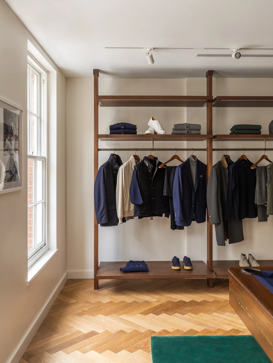 Clients enter the townhouse through our ground floor ready-to-wear showroom, and can explore several floors of retail and lifestyle space. On the first floor, our ready-to-wear collection is displayed with a bespoke handmade snooker table lined in navy blue baize, alongside a consultation and fitting space for Made-To-Measure clients.
