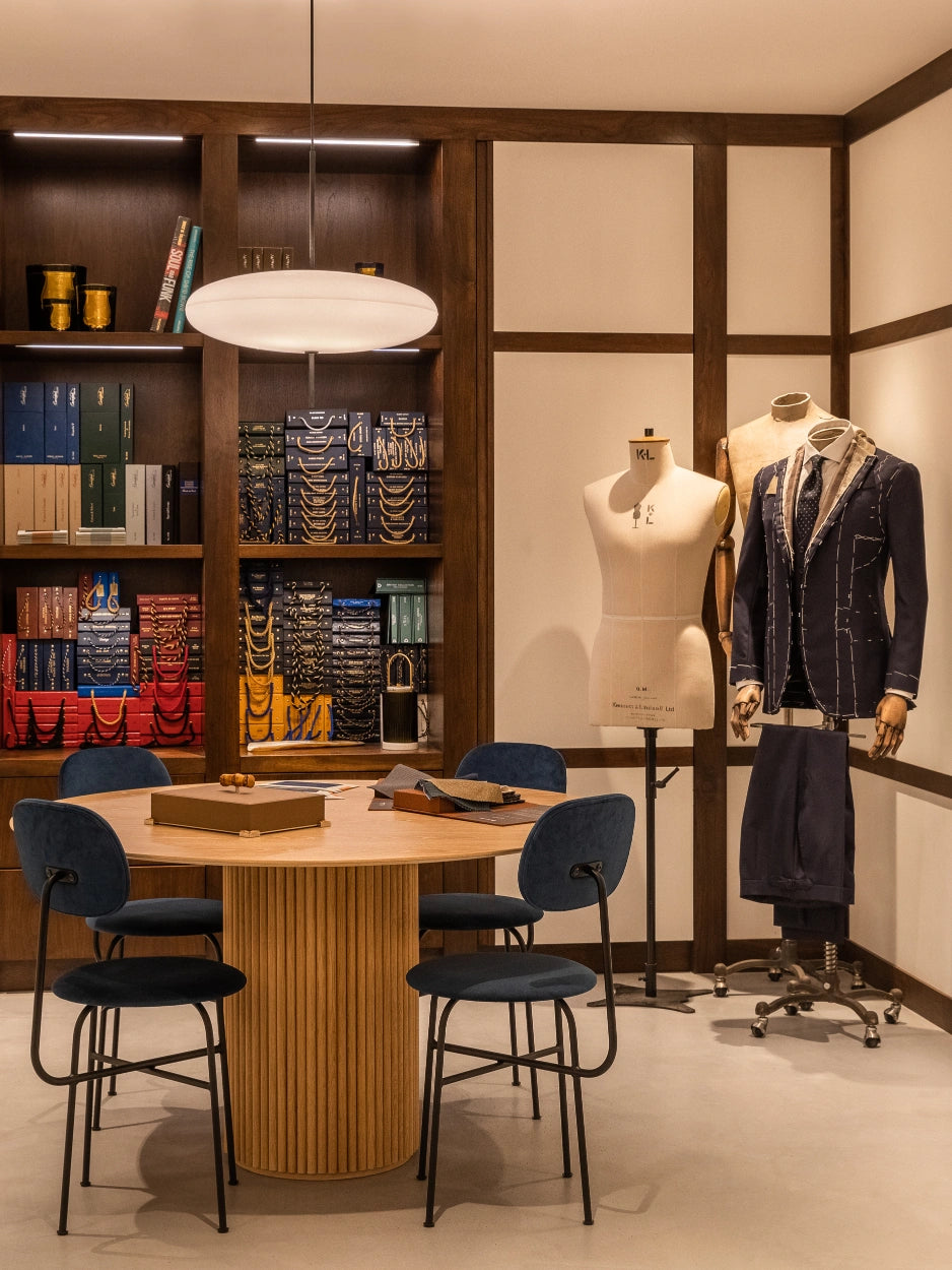 The store showcases our Ready-To-Wear collection, Bespoke and Made-To-Measure services under one roof, and hosts the workrooms for our cutters, tailors and apprentices.